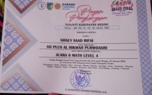 SD Plus Al-Hikmah kembali menorehkan prestasi yang membanggakan. Salah satu siswa terbaik kami, Ghaly Saad Rifai, siswa kelas 4 SD Plus Al-Hikmah, berhasil meraih Juara 6 lomba Math Level 4 dalam Grand Final Ajang Prestasi dan Seni.